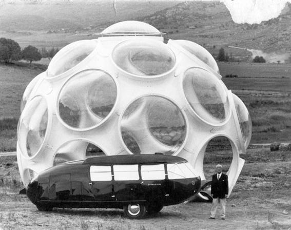 Buckminster Fuller with the 24 dome, and his Dymaxion car, in 1981.