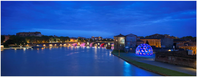 The 50′ Fly’s Eye Dome at Toulouse, featuring a new lighting design, made for the exhibit, by Phillips Corporation