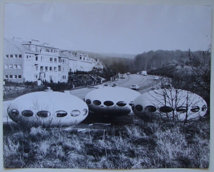 The first International Plastic House Exhibition in Lüdenscheid, West Germany, 1971, included “Orion” (in front), “Futuro” (left) “Bio-Dome” behind it, and “Rondo” behind “Orion.”