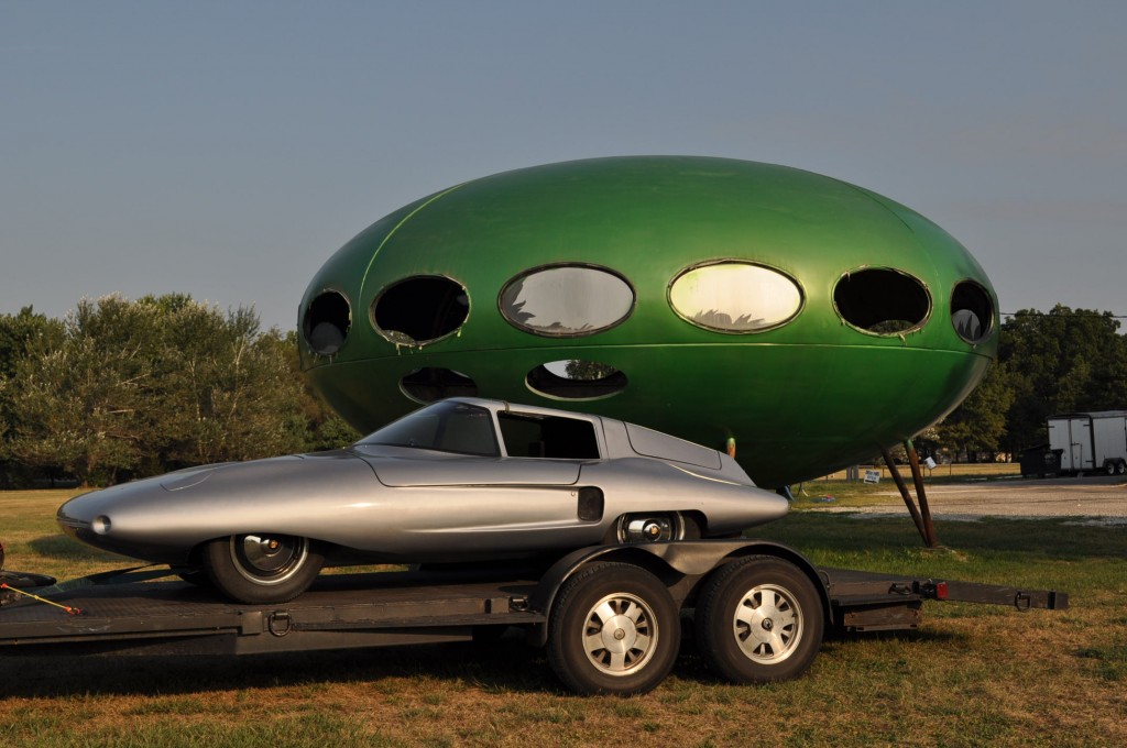 The first International Plastic House Exhibition in Lüdenscheid, West Germany, 1971, included “Orion” (in front), “Futuro” (left) “Bio-Dome” behind it, and “Rondo” behind “Orion.”