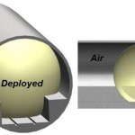 The concept of the Resilient Tunnel Plug (RTP) is a huge inflatable plug that can block tunnels (subway, vehicular traffic, etc) to isolate sections of tunnel against the spread of flood waters, terrorist gas attacks, or other fluid threats. It utilizes a layered structure of soft composite materials to create a very large ‘balloon’ that can be folded up into very compact storage. The folded plug is deployed by permanent installation in the tunnel wall and kept ready for emergencies. When needed, it inflates, blocking the tunnel.