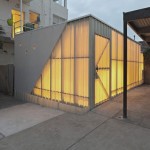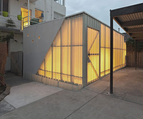 A translucent fiberglass clad carport studio by architects Edwards Moore. Not only is the facade beautiful and simple, but the use of space otherwise reserved for a car is ingenious.