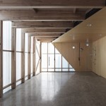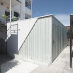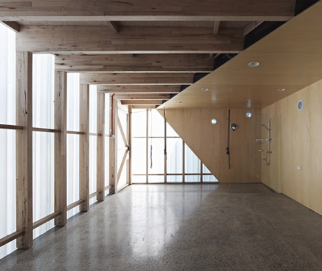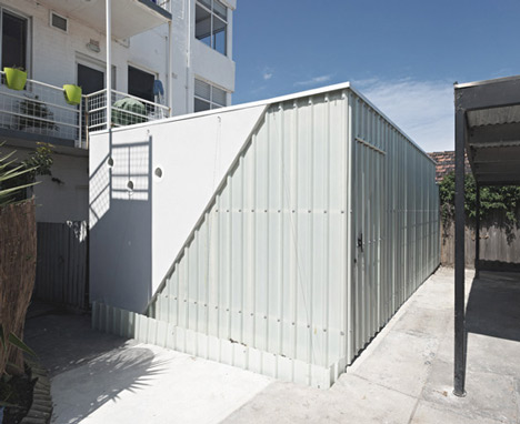 “An artist’s studio adjacent to an existing first floor art deco apartment situated in Elwood, Melbourne. The site occupies a former parking space & ownership was restricted to a maximum above ground height of 3m. The studio has been designed to accommodate a shower/wet area, canoe storage, kitchenette & WC. The external skin is a combination of a white render finish and semi-translucent fibre glass sheeting to allow light to the interior whilst also relating to the adjoining building. Internally the timber structure is expressed and partly lined with plywood. Operable porthole windows (made from inspection hatches) provide ventilation and additional natural light.”