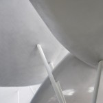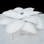 The petals are made of glass fiber and epodossic resin on a steel frame. Their opaque whiteness and soft contours seem like the exact opposite of the structures over which they billow.