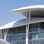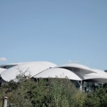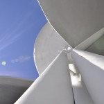 Covering, hovering over, the entire building are cluster of 11 sheltering white “petals,” free-standing roofs in rounded organic shapes, supported by tall white steel stems. They have been likened to trees, or giant mushrooms. They also might recall a certain high-end brand of potato chip.