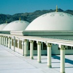 Over the main prayer hall are 27 domes made of FRP, made by Premier Composites Technologies of Dubai. The domes rest on square bases that feature openings to transmit light into the prayer areas below. The domes can also slide sideways on metal tracks to open the prayer space to the sky, and provide shade for worshipers on the roof, helping to deal with extreme temperature conditions. The light weight of the material is key to the sliding design.
