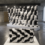 The freestanding walls featured in the exhibition Eigenforms explore how latent structural failure principles can be employed to design richly dimensional architectural surfaces and volumes. The patterning of the models specifically incorporates buckling, a mathematical instability leading to failure modes with complex sinusoidal deformations. The revolutionary Swiss mathematician Leonhard Euler was the first to capture this phenomenon with an equation in 1757. With contemporary finite element method (FEM) analysis programs, structural engineers regularly use computational implementations of Euler’s insights to study how structures may fail. Through his LeFevre-supported research, KSA Fellow Justin Diles has employed these same methods to determine how the signature deformations of buckling can be used to design intricate, puzzle-like tectonic assemblies. The black and white patterns of the exhibition models track the multiple failure modes—referred to as Eigenmodes in FEM simulation tools—brought together in each study. The resulting surfaces—portions of buckling modes grafted into new assemblies—are held together only by friction along structural flanges and freely slide apart into individual pieces. Provisionally stable, these configurations are evocative of the instability lurking within any architectural structure.