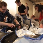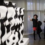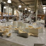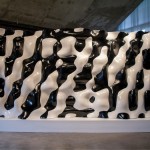 Precise fabrication procedures were required to realize the complexly-curved sinusoidal forms of the exhibition models. The components of the small models are made from 3D-printed plastic—manually-finished and painted—and the components of the large Eigenform wall are made from contemporary composite materials. Carbon fiber and E-glass reinforcement and high-strength epoxy resin were laid-up by hand in expanded polystyrene foam molds—each individually cut with the KSA Fabrication Lab’s 3-axis CNC mill—to produce parts that have a tolerance of 1/32” along joining seams. White components, each produced in a single open-faced mold, are open on one side; black components, closed volumes, required two molds to produce pieces that were fused into hollow shells. The interplay of open and closed volumes within the structure highlights the multiple possible readings of the studies: closed, thick and massive versus open, laminar and light. Despite their (often) massive appearance, the individual components of the large Eigenform wall are very lightweight. The individual elements achieve exceptional strength and stiffness relative to their mass when joined in the overall assembly.