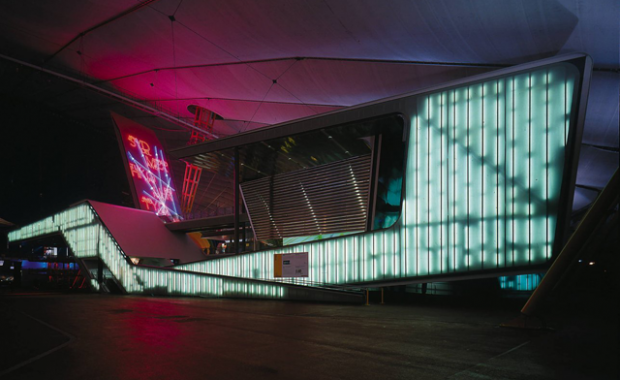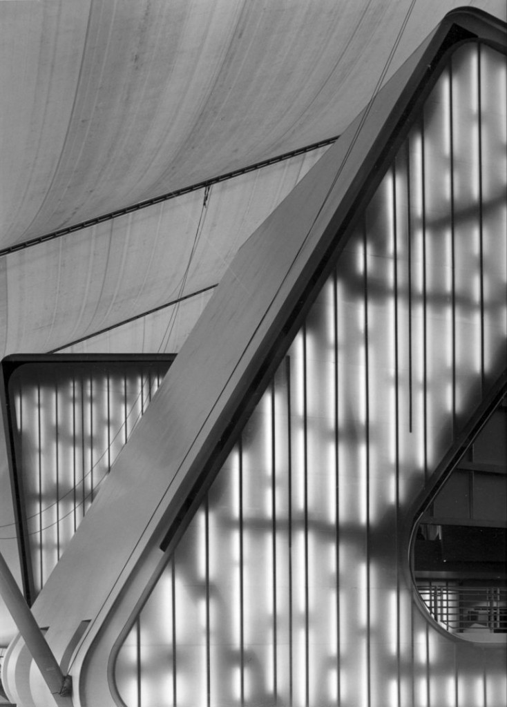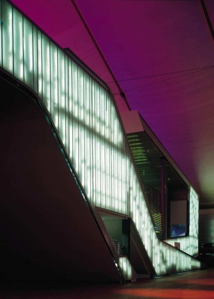 This 2,500 sqm. Mind Zone Exhibition Pavilion was designed by Zaha Hadid Architects for the UK’s Millennium Dome back in 2000. Zaha is a consistant proponent of advanced material experimentation, and this somewhat early example is no exception. The facade glows with the use of a new panel system, a colored, translucent FRP panel sandwiching an aluminium honeycomb inner layer. I am now on the hunt for later examples of this combination in architecture, as it seems to be a provocative take on the more typical balsa core between layers of FRP.