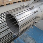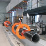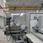 The winding method is an ingenious, mandrel-less process. The winding machine has a steel cylinder at each end of the pipe-length, with pins sticking out radially from the cylinder. The machine winds resin-wetted filament around a pin, carries it to the other end of the pipe-length and around another pin and back again. When all the longitudinal threads have been strung, they define a pipe. A curing hood is lowered over it to make the shape permanent. Then the stiffened filaments serve as a mandrel for further winding in other orientations. It’s almost like building a bridge: if you can string one cable from point A to point B, you can string many. Enough cables define a bridge, and then the structure can be filled in and beefed up.