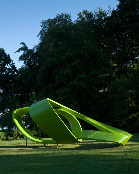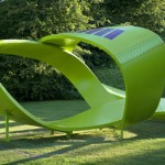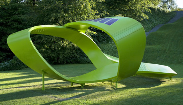 An intriguing example of sustainable, intelligent composites, this pavilion, titled ‘Learning from Nature” uses biodegradable and energy generating materials that are also self cleaning and phase changing. Instead of fiberglass and resin, the composite structure is made up of flax fibers cast in a biological resin, and cork sheets are used as the core material, replacing typical polystyrene. Designed by GXN(a subgroup of 3XN Architects) for the ‘Green Architecture for the Future’ exhibition at the Louisiana Museum of Modern Art