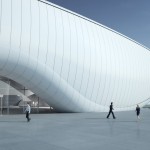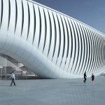 The Thematic Pavilion for EXPO 2012 in Yeosu, South Korea was a grand, gilled structure called One Ocean, designed by the Austrian architecture firm soma. It features a bio-mimetic façade composed of vertical lamellas (a word that refers to thin, plate-like structures in animals, such as gills, as well as the ribs on the underside of mushrooms) made of glass fiber reinforced polymer (GFRP). The lamellas are flexible, and are opened and closed to vary interior lighting and solar heating, as well as to animate the views into and out of the building. The visual theme of the lamellas is carried into the interior, specifically in curving fin-like elements that translate onto the ceiling, but also in the continuity of curves that generally permeate and define the building.