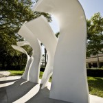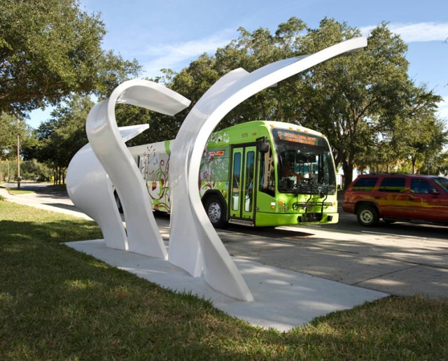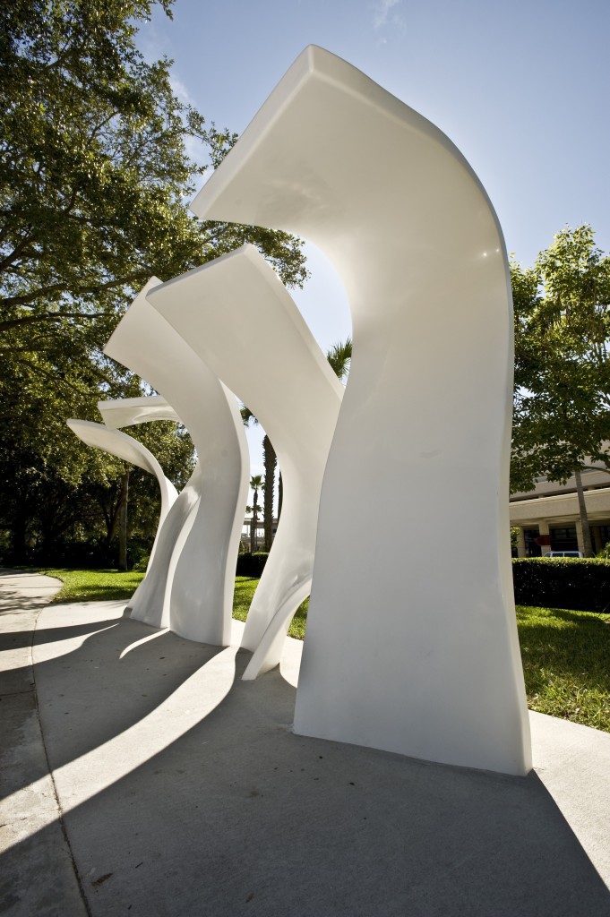 The Cascade Series is composed of four separate works of art along International Drive around the Orlando Convention Center that are used as functional bus shelters for the local transit company. Each is a compilation of two to five separate composite forms, each approximately three feet wide and fifteen to sixteen feet high, that together create shelter for bus riders from the intense heat and rain of central Florida.