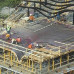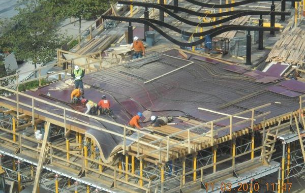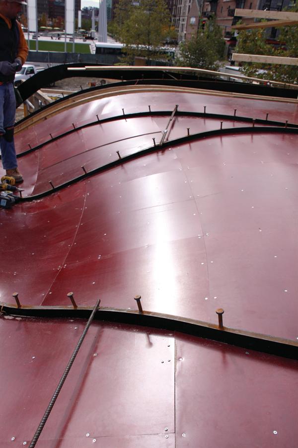 Because of the contours of the roof canopies and the more than 400 sheets of plywood the project required, the forms simplified the construction process, added to the overall aesthetic of the project, and saved countless hours of construction time.