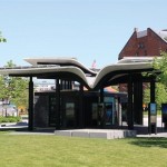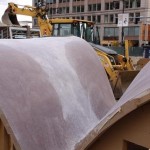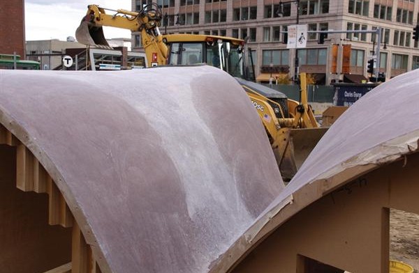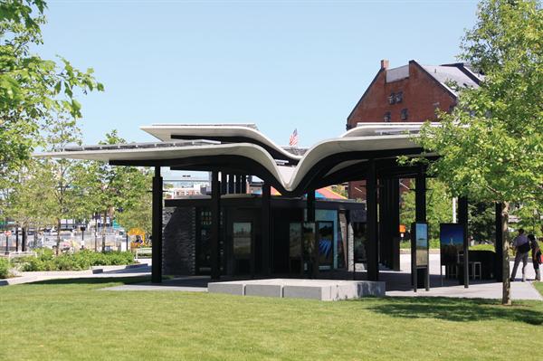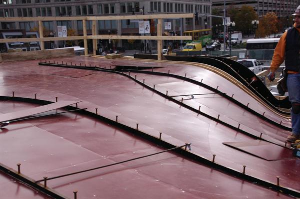 The roof of the Boston Harbor Park Pavilion relied heavily on current computer modeling and CNC technology, as well as a creative use of concrete, fiberglass, plywood, and screws to achieve the complexly curved form.