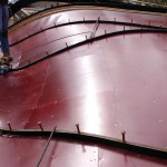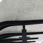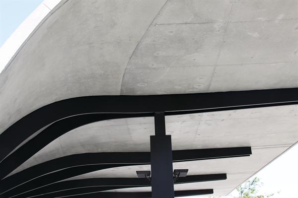 The project combined shaping plywood sheets to contoured ribs for the more subtle curves and using plywood forms for the two deeply curved, multi-directional areas. The two canopies measure 40×50 feet and 40×60 feet. CW Keller realized that after pouring the concrete, the seams and screw heads would be visible underneath the canopy, so they suggested pre cutting the plywood sheets with edges to create an interesting visual element, as well as creating a pattern for the screw heads and pre drilling those holes. All of these pieces were shipped to the site, ready to assemble.