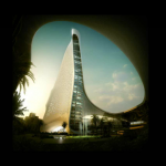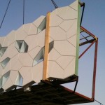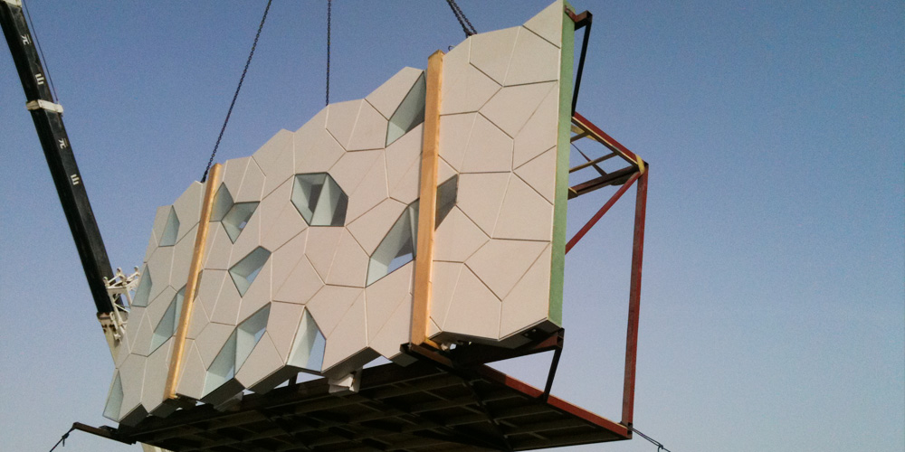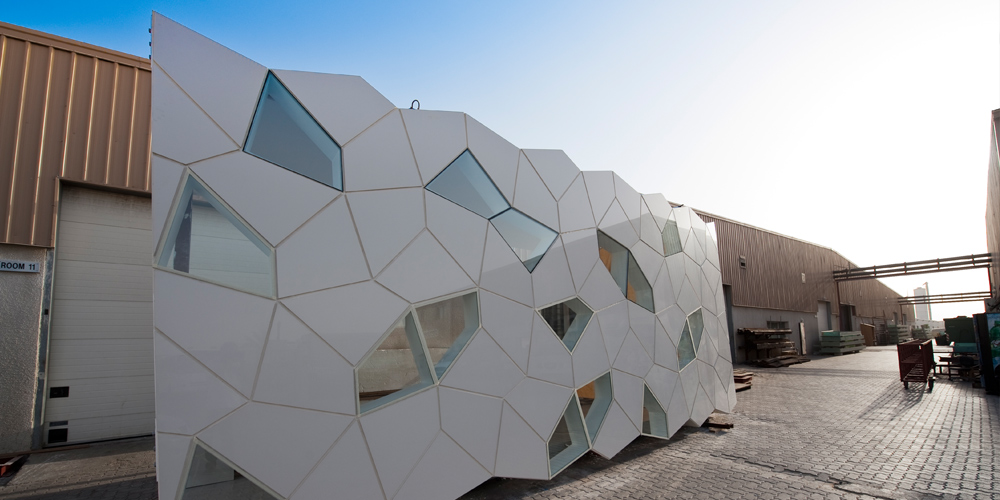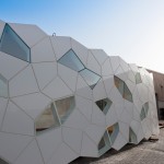 The facade for this huge complex designed by Snohetta is fabricated by PCT. The panels are approximately 8m x 4m, and about 1000 panels will clad the exterior. Each panel has a complex bi-axial curved shape and is made from a sandwich of glass fiber and epoxy resin composites with a structural foam core and is fully insulated to reach an optimum U value. Structural bonded windows are built into the facade and each panel is topped with ceramic slabs in a repetitive geometric pattern. From Snohetta: