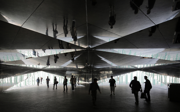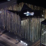 “Symbol of energy: At the Expo Korea the corporate pavilion of GS Caltex, a Korean oil corporation, illustrates the company’s mission and its visions for the future. The pavilion architecture is presented as a dynamic ensemble which, at first glance, is reminiscent of an outsized rice field. Eighteen metres high, so-called blades sway like grass in the wind. Touching activates individual sensitive blades and illuminates them. A centrally located star-shaped, mirrored pavilion building is optically withdrawn in its entirety. Via raised corners of the star, the visitor can gain access to the also mirrored entrance area on the ground floor. The centre of the pavilion is on the upper floor; a seven-metre-high round room with panoramic projection. Poetic images in a reduced black-and-white aesthetic convey the company’s readiness to assume responsibility with regard to sustainable energy concepts.”