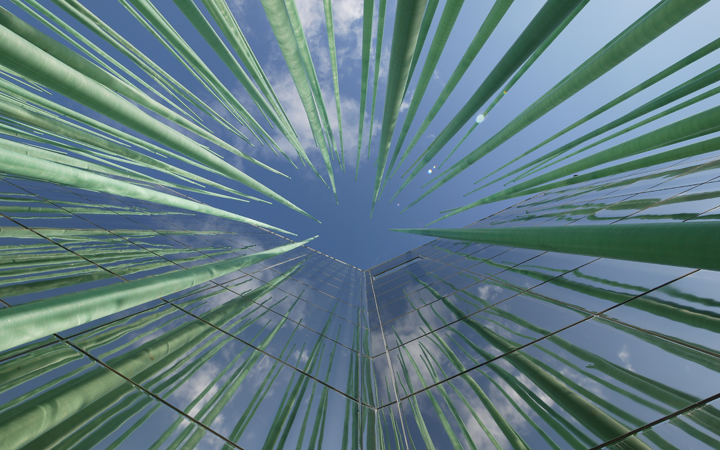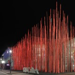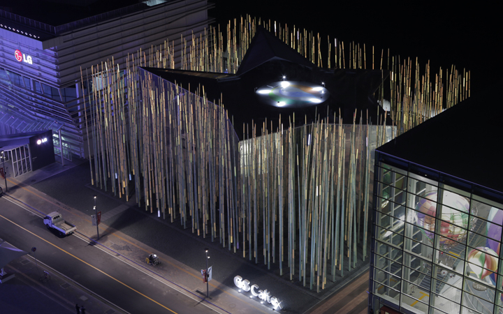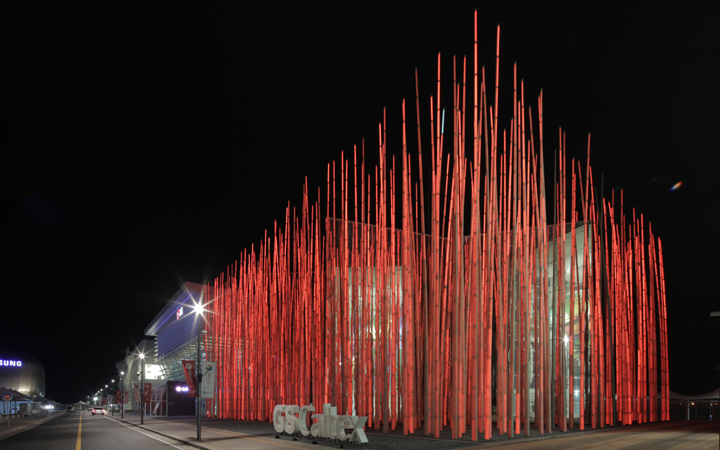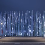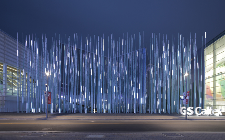 The incredibly tall thin blades creating a field around the GS Caltex pavilion at Expo Korea were fabricated out of fiberglass. Their flexibility allows them to move in the wind, and their translucency, coupled with dynamic lighting, creates a glowing, ever-changing facade, drawing visitors in to the star shaped center pavilion the field conceals.