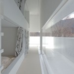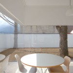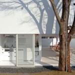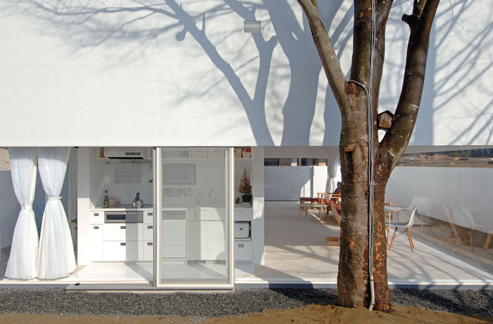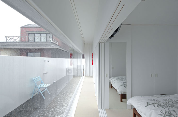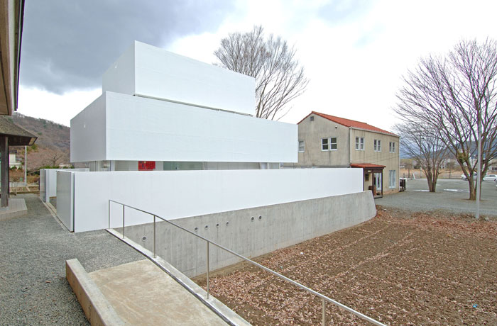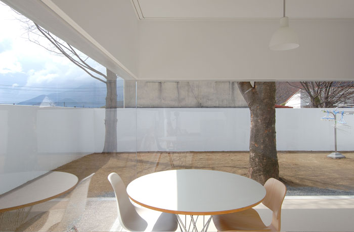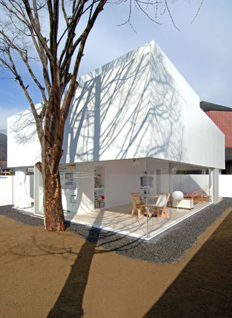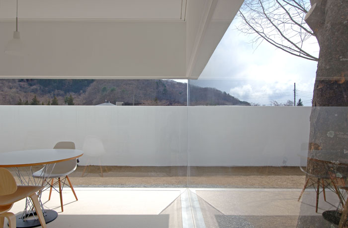 The Acrylic House in the town of Kawaguchiko, Japan, near Mt Fuji is so named for the expanse of acrylic used for the lower facade. The 20 mm thick PMMA sheets reflect little light, this invisibility renders the white FRP-clad upper facade weightless. These white strips consist of a steel framework over which fiberglass sheathed plywood is placed. Architect Takeshi Hosaka sought to both protect privacy and connect to the natural surroundings, utilizing concrete walls to block views, and the seamless, column-less expanses of acrylic to open others up.