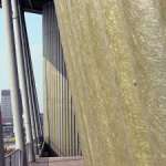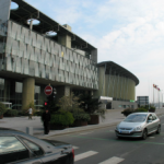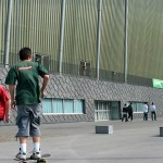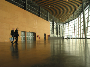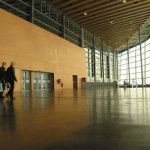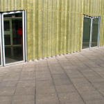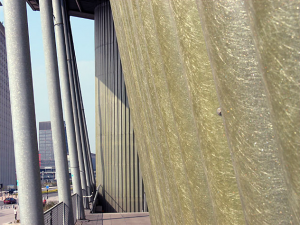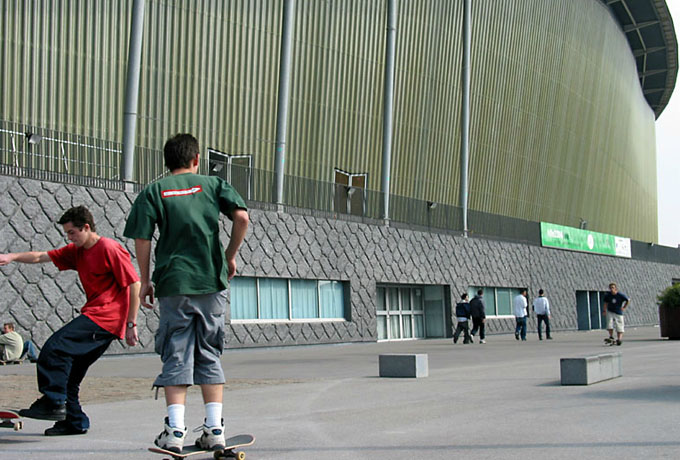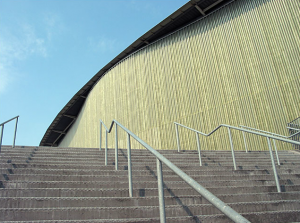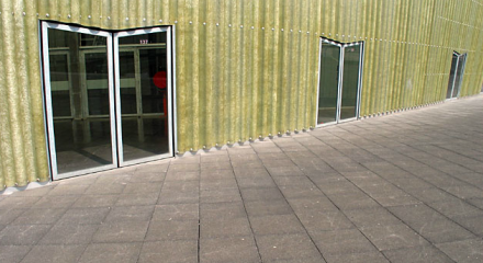 Architect Rem Koolhaas designed these three interconnecting spaces of convention hall, exhibition hall, and Zenith Arena as part of a larger city redevelopment plan that began in 1980 for the city of Lille, France. This set of spaces was completed in 2004, and has a wide range of facades distinguishing one programatic volume from the next. Patterned concrete, faceted glass, and below, corrugated translucent fiberglass panels break up the gigantic 45,000 sq meters of space. Find more images or go to the center’s website for more info and 360 degree photos of the other facades and interiors.