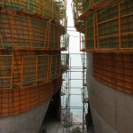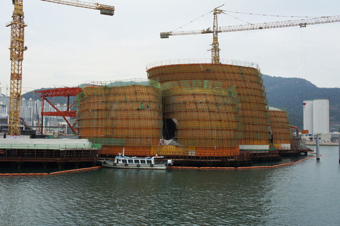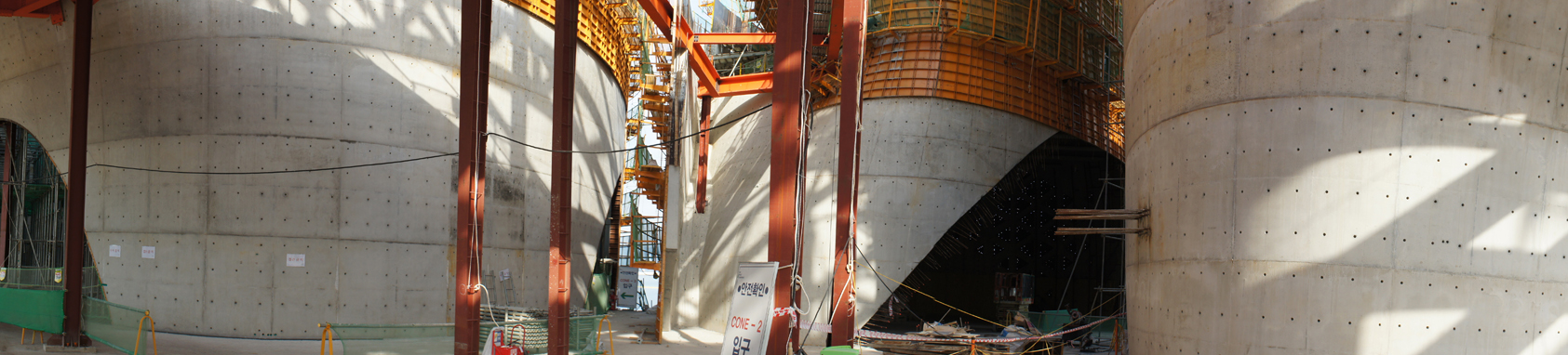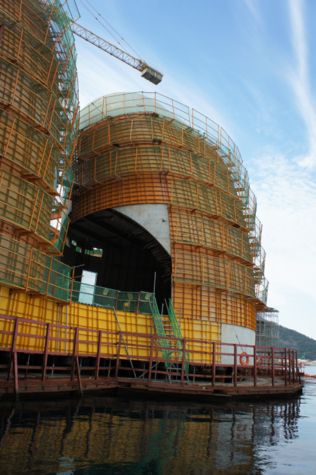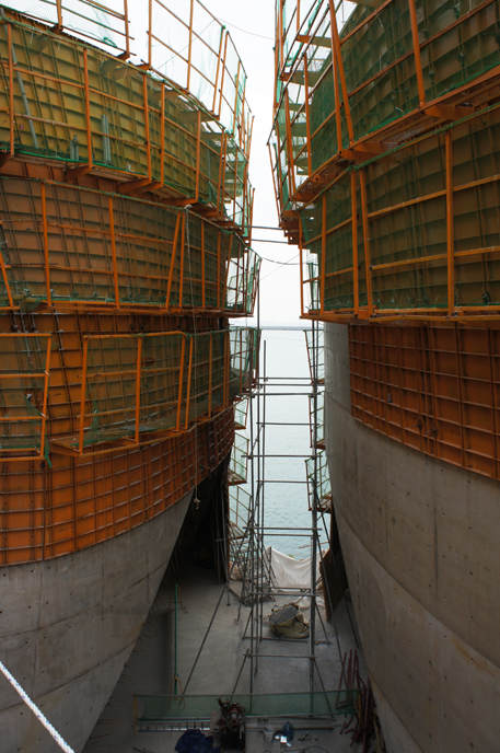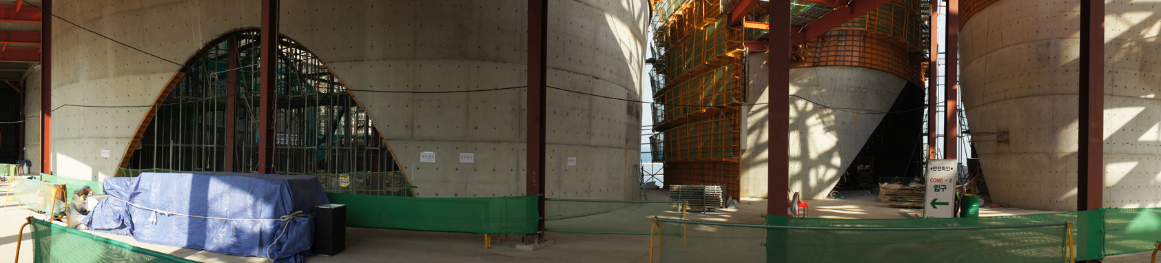 Structure-The different appearances of the building – open towards the Expo site and compact towards the sea- is also routed in the constraints of the site. Facing the open sea the reinforced concrete cones prevent the pavilion from damage through typhoons and high waves. The roof and the kinetic façade will have a steel sub-structure. The kinetic façade will be produced out of FRP and uses the material characteristics and flexibility for its mode of operation.