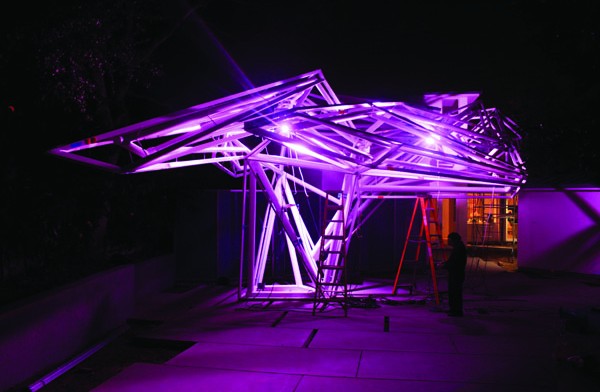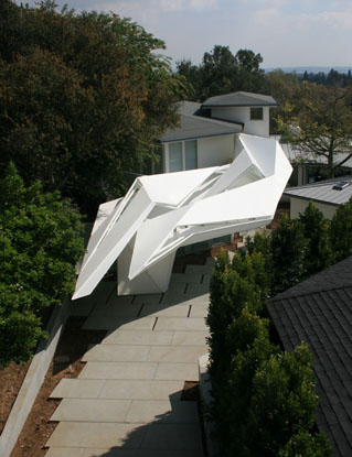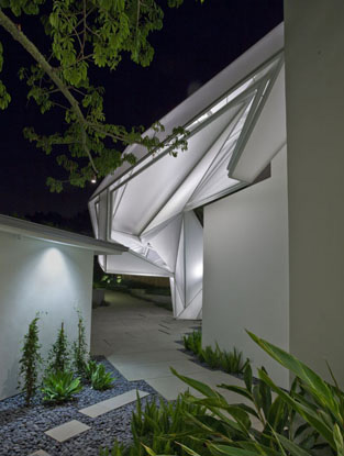 Designed by B+U, this exterior canopy addition to a residence in Pasadena, CA is comprised of a steel frame and resin coated fiberglass sheets.Part of a larger renovation of the house, these panels are referred to in the architect’s description as white translucent fabric. Below is the description of the project as found on the firm’s website.
