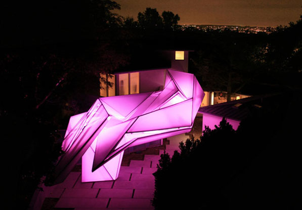 The Frank and Kim residence is located 9 miles north of downtown Los Angeles on a hillside property in Pasadena. Approaching the existing house, on the edge of the hillside, one passes by oak trees and a lush landscape through the elongated front of the property and enters the house from the north. The two story, single family home reveals itself to the south facing hillside with a large terrace and a pool overlooking San Marino. The program was to activate the front property so it can be used for larger social gatherings and pronounce a new entry to the house, as well as remodeling the majority of the interior, creating a showcase home for its owners. For the front yard we proposed two sculptural elements, a gazebo and a canopy. The gazebo will be used for receptions and larger events, and the canopy forms a new dynamic entrance to the house. These two, 60 feet long cantilevering steel structures are clad with white translucent fabric and are lit from the inside to illuminate the garden with a soft glow during the evening. They mark a path through the landscape and articulate a vibrant entry to the building. On the inside of the house this idea of glowing elements continues by transforming partitions into semi-transparent light elements. These visually connect the newly designed master bathroom and master bedroom and kitchen with the remaining areas of the house. The partitions continue from inside to the exterior, framing a path from each room into the landscape, and are made out of extruded polycarbonate tubing. Part of the design concept was also to develop a thorough sustainability concept for the residence that includes a Photovoltaic roof, natural ventilation; (FSC) certified sustainable harvested sources, low voc materials, and radiant cooling and heating.
