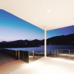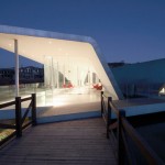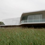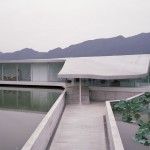 A continuous, reflective surface emerges out of the water, firstly becoming the roof and then the walls of the house. This surface blurs the distinction between solid and liquid elements, between building and environment. A sunken garden and a swimming pool frames each side of the house. Both are flush with the surface of the lake, a seamless union of the natural and the man-made.