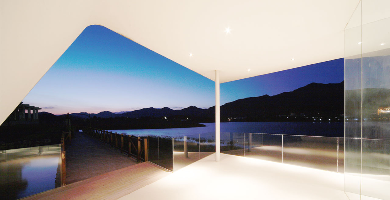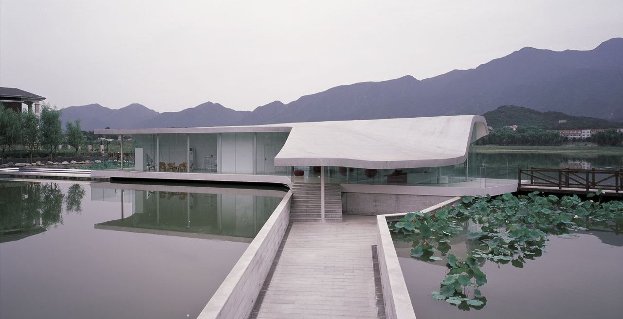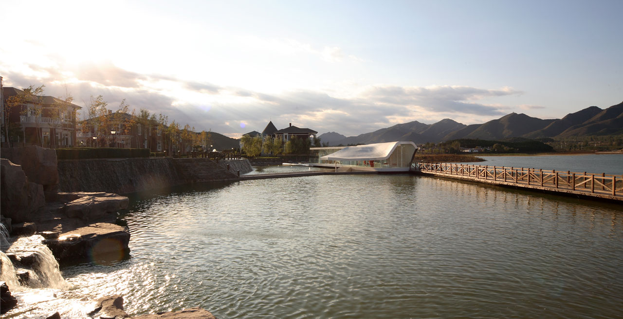 Hongluo Villa District is situated in the north of Beijing along the coastline of Hongluo Lake; it holds an impressive view of the mountains and landscape beyond. A wooden bridge traverses the lake upon which the clubhouse sits. The gentle structure appears to float on the water, echoing the surrounding mountains, and becoming a focal point for the whole area.