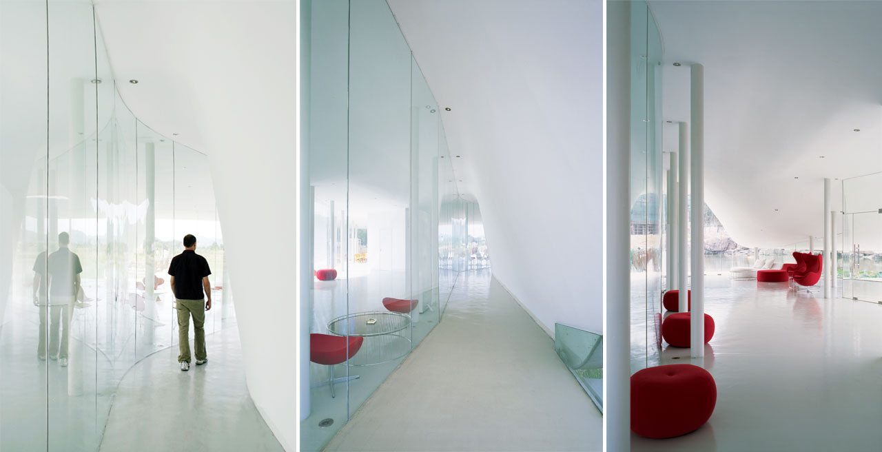In too many books and articles on architecture the material of a projects described incorrectly, it is important to study an interesting precedent carefully. The design intent of this project is atectonic, the role of the flowing folded roof surface is to define space and provide reflectance. The materials are not used in